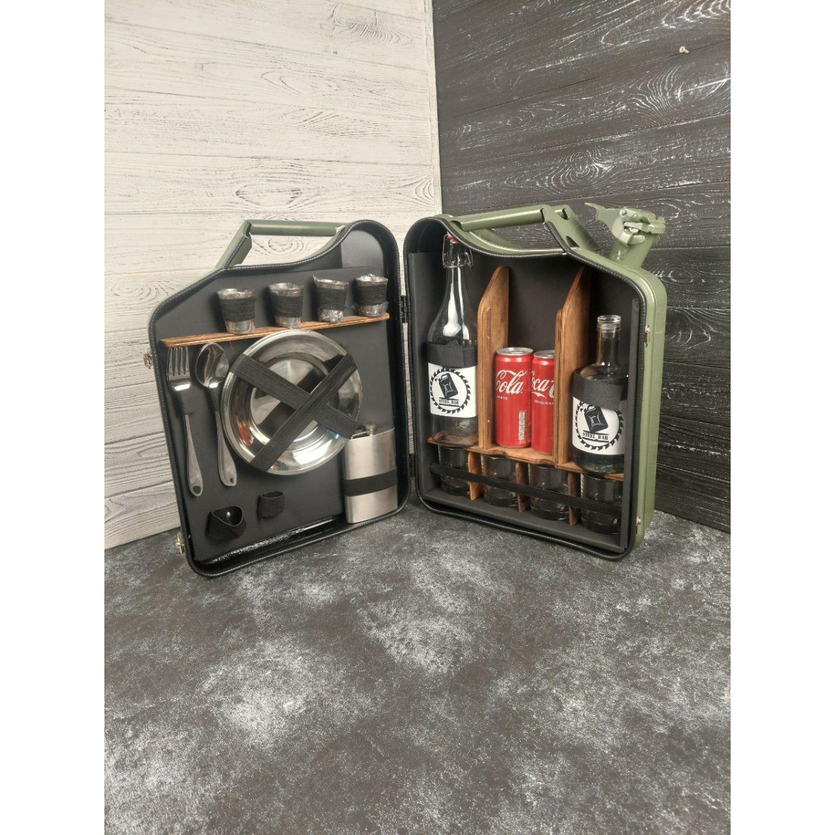 Цей стильний та функціональний міні-бар виготовлений зі справжньої металевої каністри об'ємом 20 літрів. Він розроблений для розміщення двох пляшок (1 л та 0,7 л), чотирьох банок об'ємом 0,33 л та чотирьох склянок об'ємом 250 мл. На лівій стороні розміщуються посуд для чотирьох осіб, фляга, а також цигарки, запальничка або солодощі.