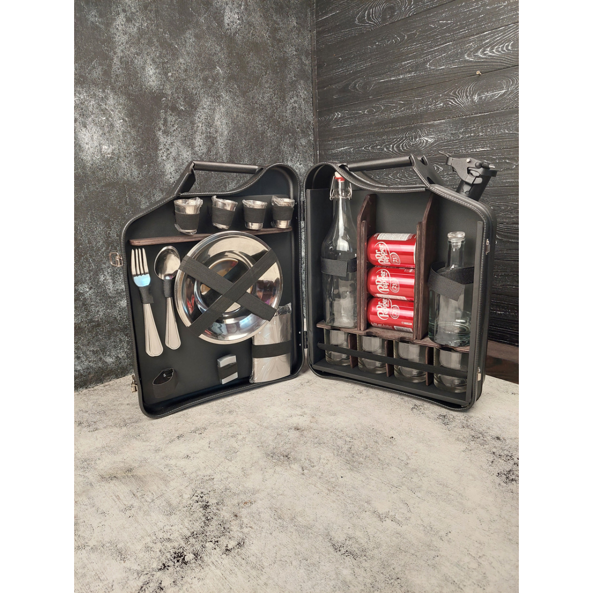 Цей стильний та функціональний міні-бар виготовлений зі справжньої металевої каністри об'ємом 20 літрів. Він розроблений для розміщення двох пляшок (1 л та 0,7 л), чотирьох банок об'ємом 0,33 л та чотирьох склянок об'ємом 250 мл. На лівій стороні розміщуються посуд для чотирьох осіб, фляга, а також цигарки, запальничка або солодощі.